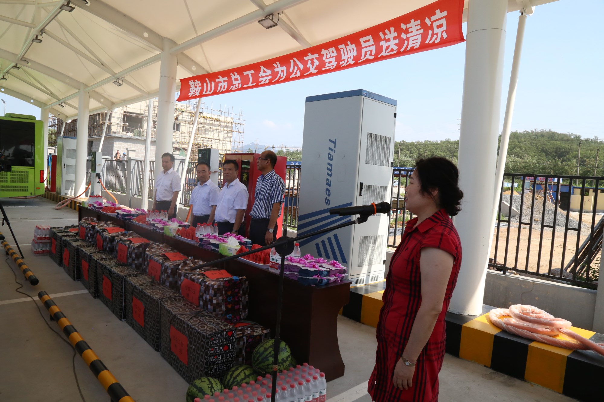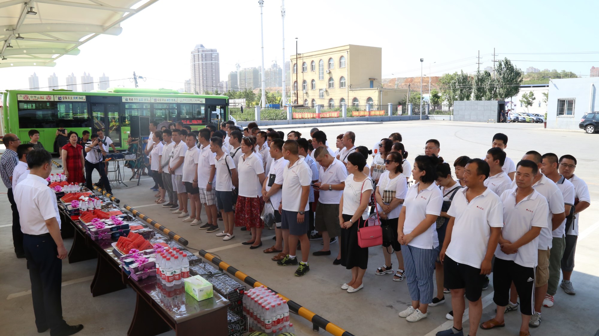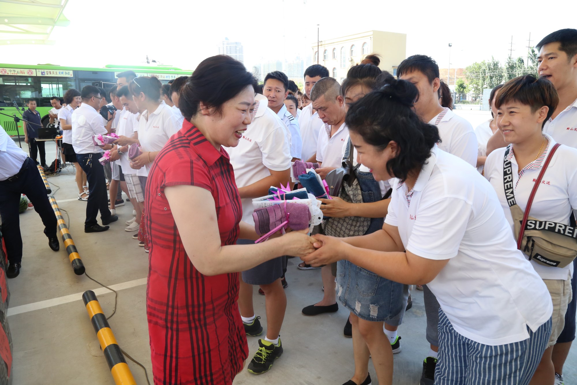 2018年8月1日下午,鞍山市總工會在交運(yùn)集團(tuán)第二汽車分公司216路終點(diǎn)站舉行了為公交一線駕駛員送清涼活動。鞍山市人大常委會副主任、市總工會主席解永孚;市總工會副主席李展程;市國資委黨委書記、主任顧洪新等領(lǐng)導(dǎo)來到216路調(diào)度室看望了交運(yùn)集團(tuán)一線駕駛員,為他們送去夏日里的清涼與工會組織的慰問。交運(yùn)集團(tuán)黨委書記、董事長羅玉艷;總經(jīng)理王春江;黨委副書記、紀(jì)委書記、工會主席金秀石出席了活動;顒又,交運(yùn)集團(tuán)黨委書記、董事長羅玉艷向市總工會領(lǐng)導(dǎo)介紹了企業(yè)生產(chǎn)運(yùn)營情況,并代表集團(tuán)職工向市總工會表示感謝。隨后,市總工會主席解永孚代表市總工會對高溫酷暑中仍堅(jiān)守崗位、辛勤工作的交運(yùn)一線職工致以親切的問候,希望交運(yùn)集團(tuán)廣大職工繼續(xù)發(fā)揚(yáng)艱苦奮斗、愛崗敬業(yè)精神,注意防暑和行車安全,以更好的狀態(tài)投入到工作中服務(wù)好市民乘客,并將市總工會撥付的2萬元慰問金交到交運(yùn)集團(tuán)董事長手中。第二汽車分公司2路線駕駛員謝金紅在活動中代表一線駕駛員作了表態(tài)發(fā)言。最后,各級領(lǐng)導(dǎo)在現(xiàn)場親手將交運(yùn)集團(tuán)工會為一線職工準(zhǔn)備了冰袖、毛巾、西瓜、冰鎮(zhèn)礦泉水等慰問物資發(fā)到職工手中。