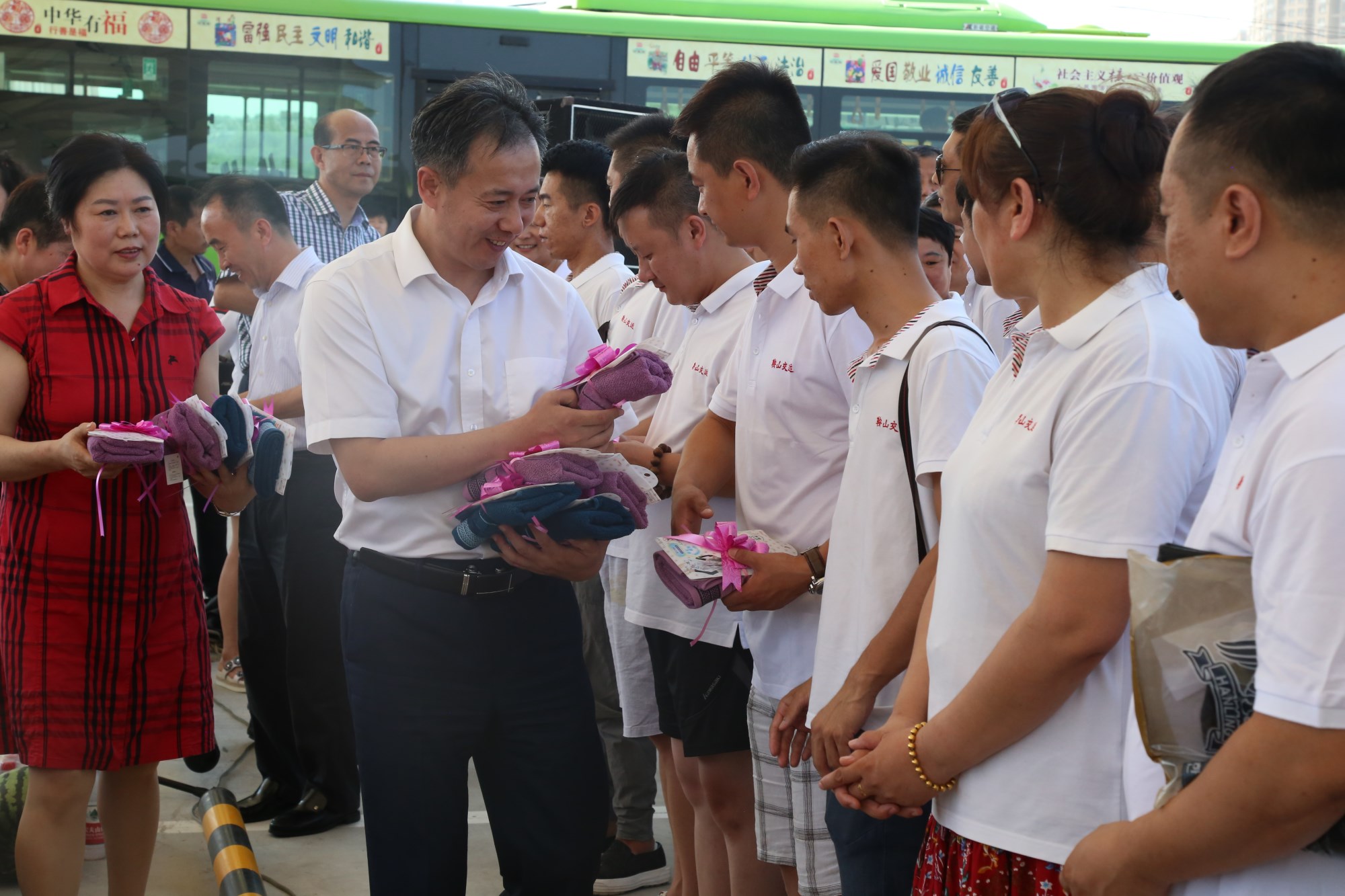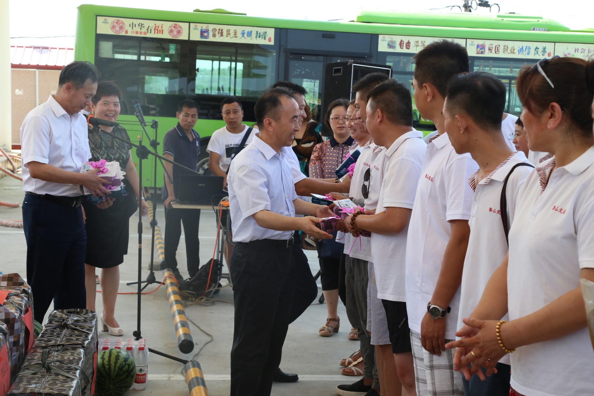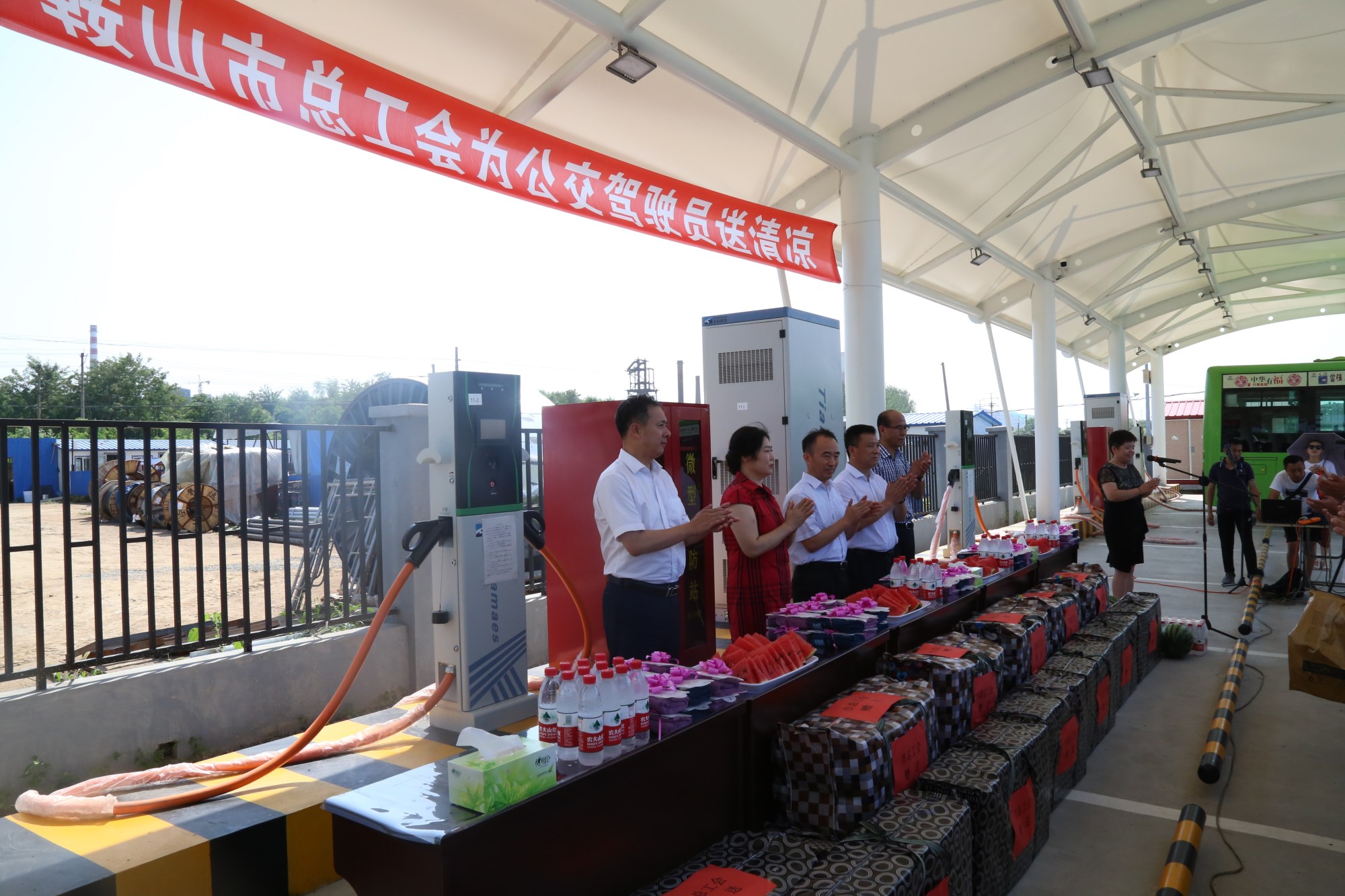 2018年8月1日下午,鞍山市總工會在交運(yùn)集團(tuán)第二汽車分公司216路終點(diǎn)站舉行了為公交一線駕駛員送清涼活動。鞍山市人大常委會副主任、市總工會主席解永孚;市總工會副主席李展程;市國資委黨委書記、主任顧洪新等領(lǐng)導(dǎo)來到216路調(diào)度室看望了交運(yùn)集團(tuán)一線駕駛員,為他們送去夏日里的清涼與工會組織的慰問。交運(yùn)集團(tuán)黨委書記、董事長羅玉艷;總經(jīng)理王春江;黨委副書記、紀(jì)委書記、工會主席金秀石出席了活動;顒又,交運(yùn)集團(tuán)黨委書記、董事長羅玉艷向市總工會領(lǐng)導(dǎo)介紹了企業(yè)生產(chǎn)運(yùn)營情況,并代表集團(tuán)職工向市總工會表示感謝。隨后,市總工會主席解永孚代表市總工會對高溫酷暑中仍堅(jiān)守崗位、辛勤工作的交運(yùn)一線職工致以親切的問候,希望交運(yùn)集團(tuán)廣大職工繼續(xù)發(fā)揚(yáng)艱苦奮斗、愛崗敬業(yè)精神,注意防暑和行車安全,以更好的狀態(tài)投入到工作中服務(wù)好市民乘客,并將市總工會撥付的2萬元慰問金交到交運(yùn)集團(tuán)董事長手中。第二汽車分公司2路線駕駛員謝金紅在活動中代表一線駕駛員作了表態(tài)發(fā)言。最后,各級領(lǐng)導(dǎo)在現(xiàn)場親手將交運(yùn)集團(tuán)工會為一線職工準(zhǔn)備了冰袖、毛巾、西瓜、冰鎮(zhèn)礦泉水等慰問物資發(fā)到職工手中。